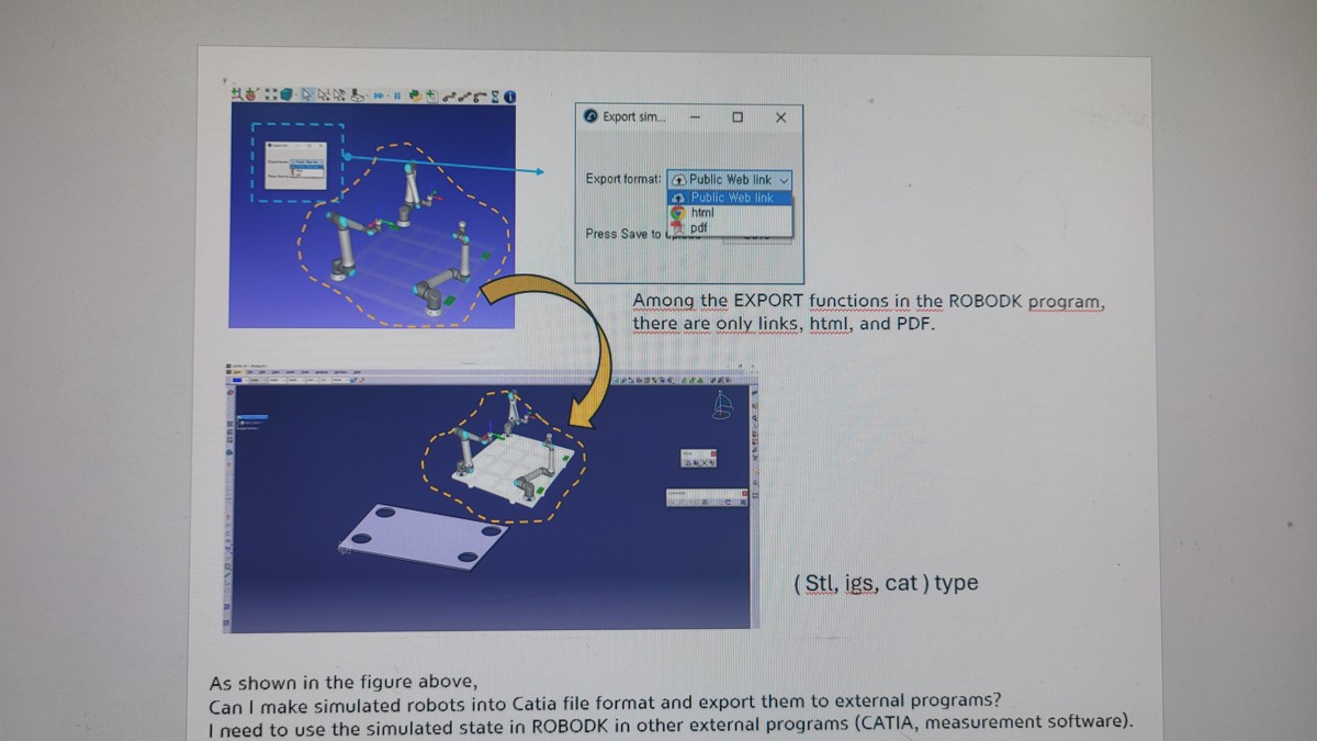 I understand you are trying to export from RoboDK to Catia. In that case, you can right click an object and select Save as STL. It is currently not possible to export the whole scene as STL. You can export as a RoboDK for Web link, a 3D PDF or an HTML simulation.