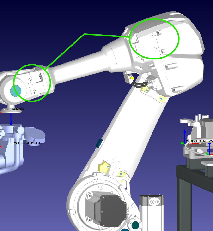 Is there a way to attach objects to the different joints of a six axis robot arm so that they are represented for simulation and collision purposes? We have cable management hardware and a couple of electrical boxes that are attached to the arm and I would like to add them so that the simulations and collision detection are accurate. I have added an image showing where I would like to attach some models.