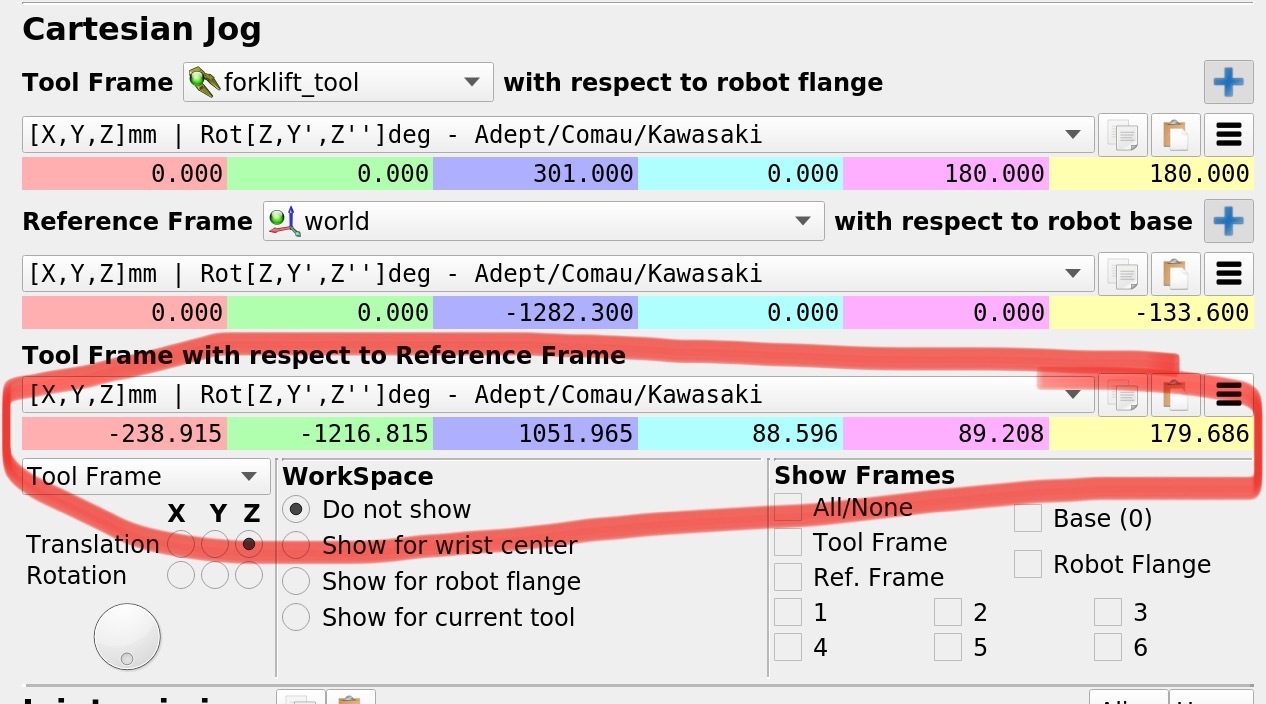 You should simply use the Pose function of a robot to get the pose of the tool with respect to the reference frame.