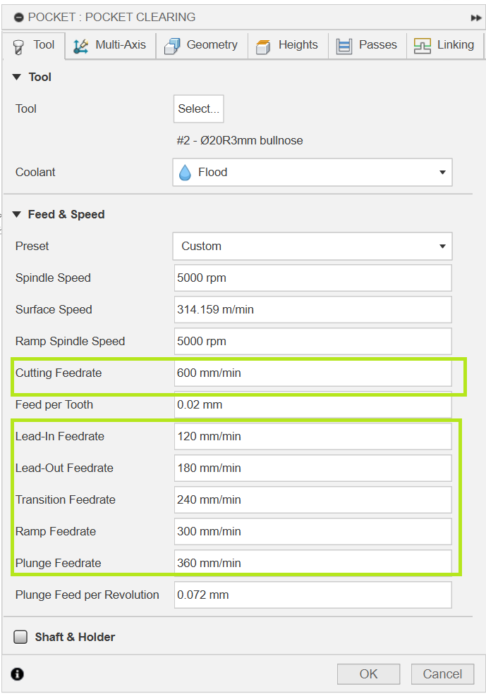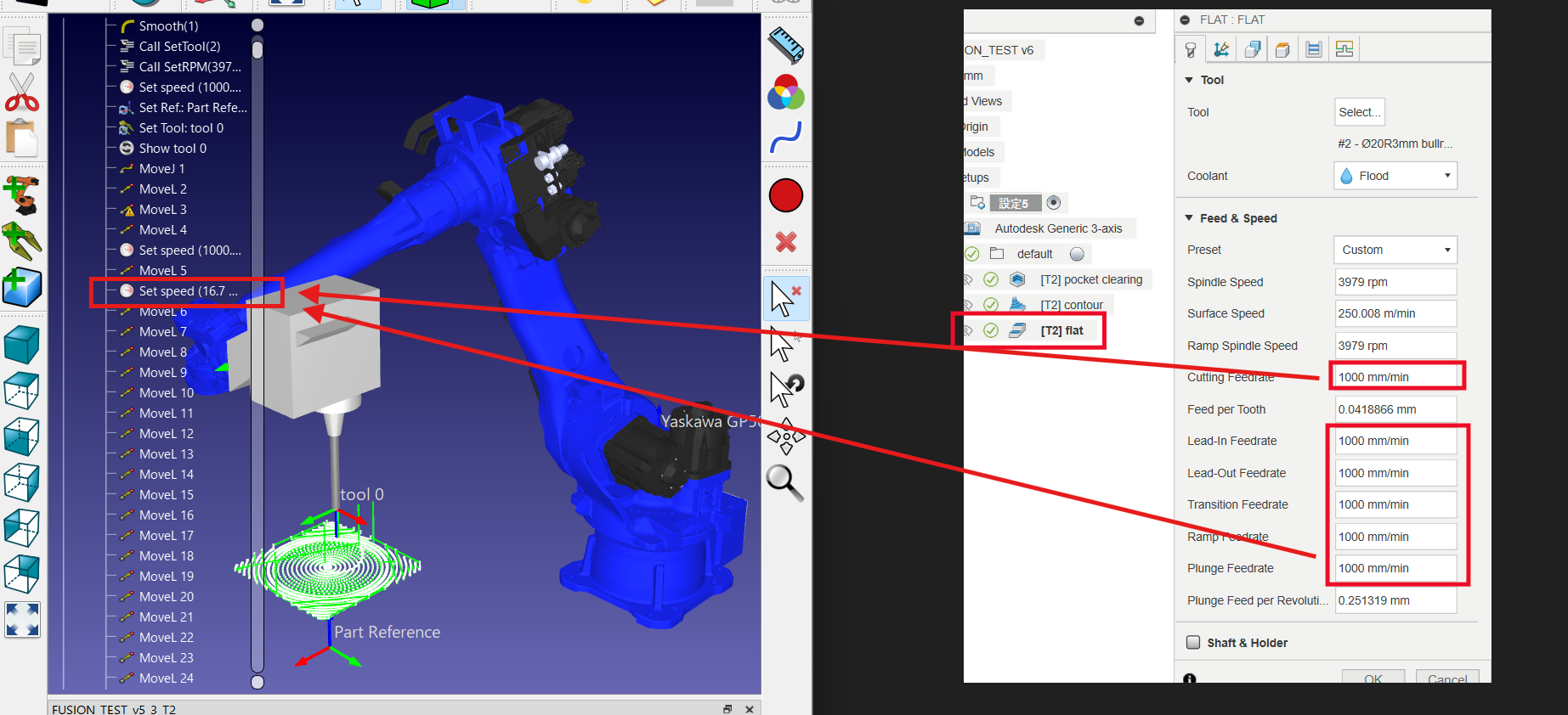 As I explained in the first post, when comparing the pocket clearing, contour, and flat machining data set in the attached Fusion with the same machining feed rate for all three, and the data set with different machining feed rates for all three, the machining feed rate set in Fusion is correctly reflected in the robot machining program.