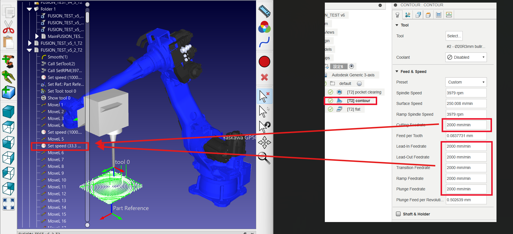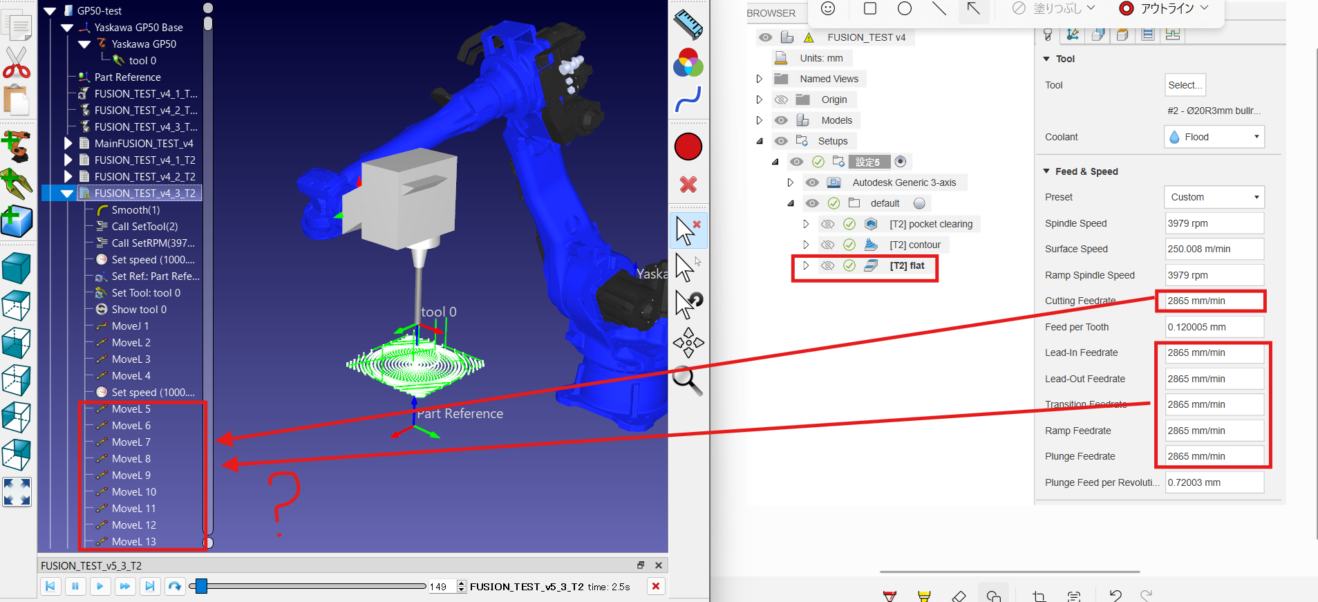 What is bothering me is that in Fusion, the feed rate for machining the workpiece should be 47.8 mm/s (2865 mm/min), but after importing it into RoboDK, 47.8 mm/s is not output in FUSION_TEST_v4_2_T2 and FUSION_TEST_v4_3_T2 when creating the robot machining program (at this time, the machining feed rate in Fusion is the same value for all data).