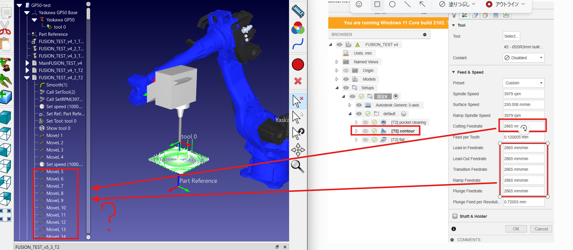 In this case, the machining operations are performed at 1000 mm/s from the beginning to the end of the v4_2 and v4_3 programs, but this does not reflect the machining speed set in Fusion, which is different from my intention.