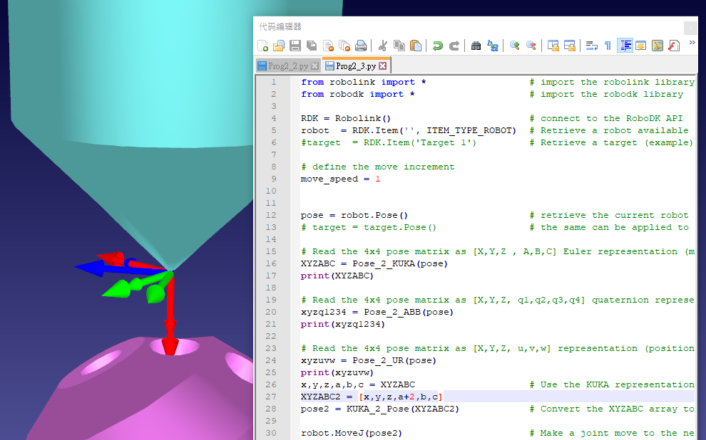 If your TCP is positioned in the center of the hole of the part attached to the flange and you know the XYZ position of the fixed tool, you can simply call some MoveLs with constant XYZ rx ry and simply modify the rz of the target. Here's a link to our API documentation with some examples: https://robodk.com/doc/en/PythonAPI/intro.html Jeremy