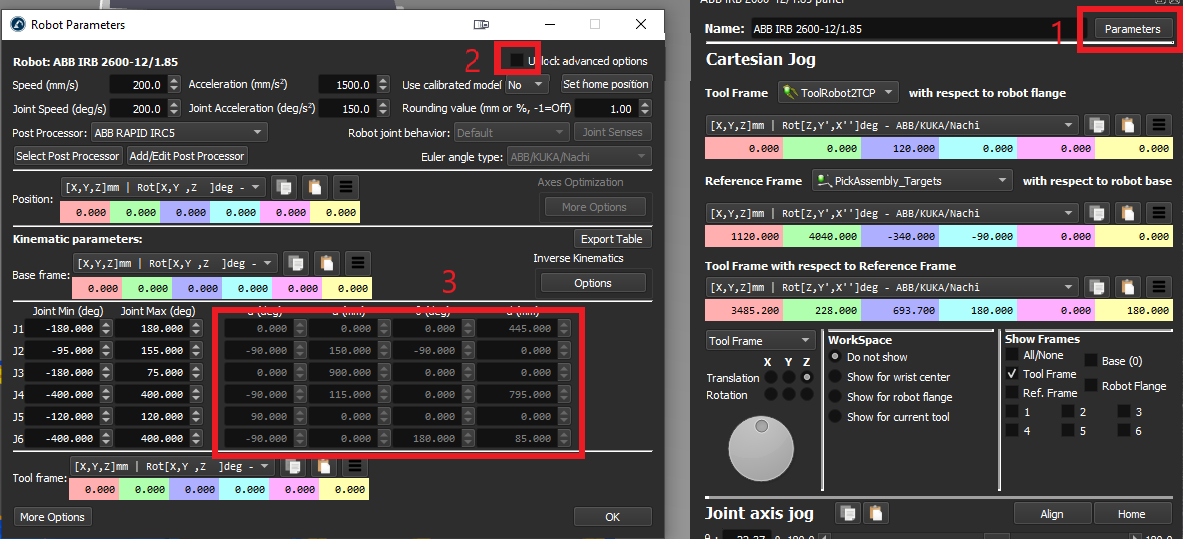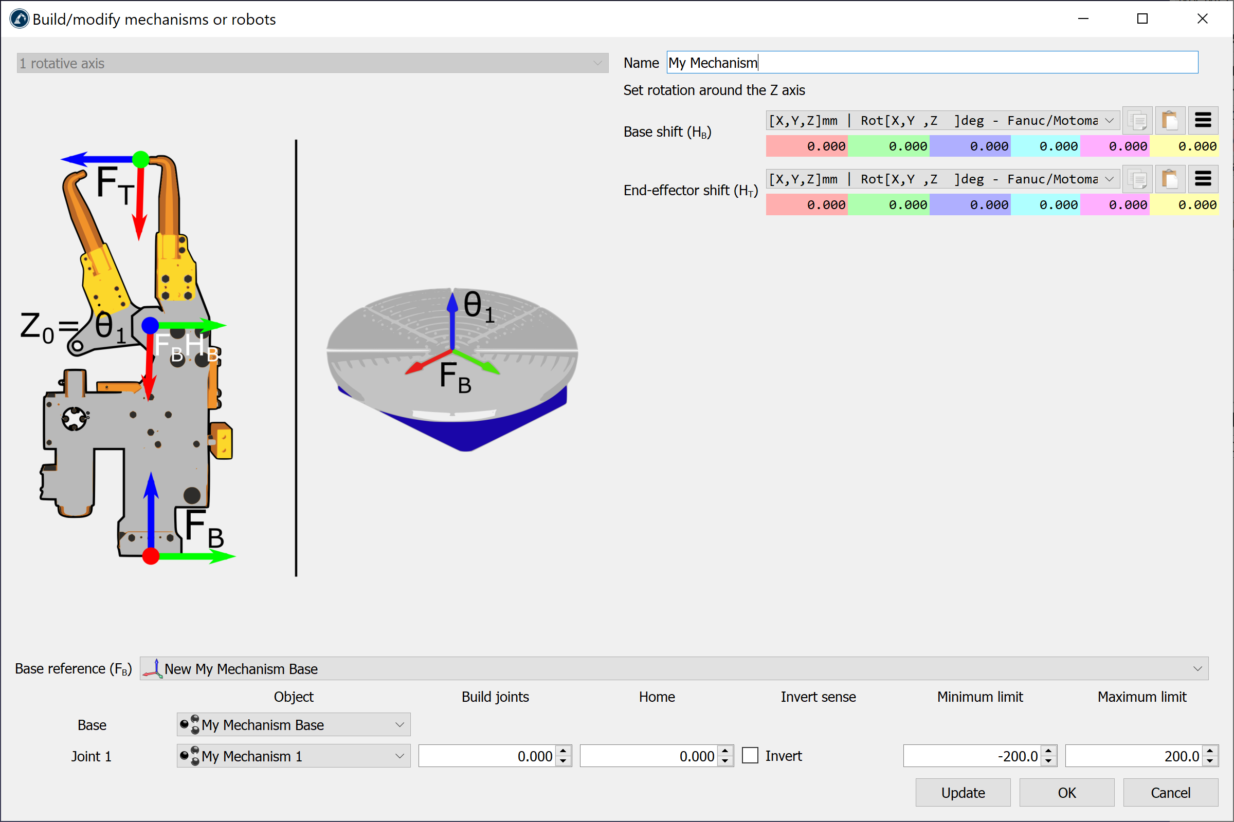When I do right click > "Modify robot" on a previously build mechanism in the station tree, the "Build/modify mechanisms or robot" window pops up (see image 2 below), but it seems all settings of the mechanism are lost: the selected axes, base shift (HB), end effector shift (HT), Base Reference (FB), the selected objects etc. Also it is suddenly set to a 1 rotative axis, and can't be changed anymore.
