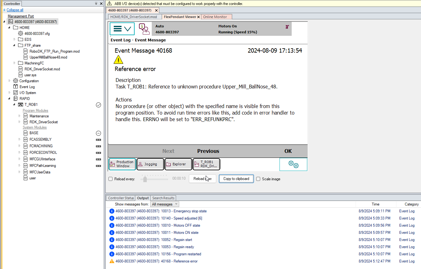 Using Robot Studio to look at the controller, here is what it looks like when we started.  The RDK driver is running: