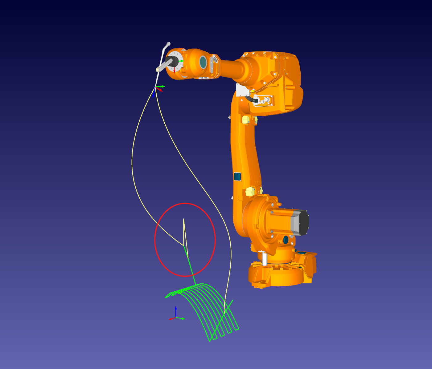 The green line reflects the path you want to follow (curve) and the yellow line represents the path that the TCP follows (program trace) including the section from where the robot started.