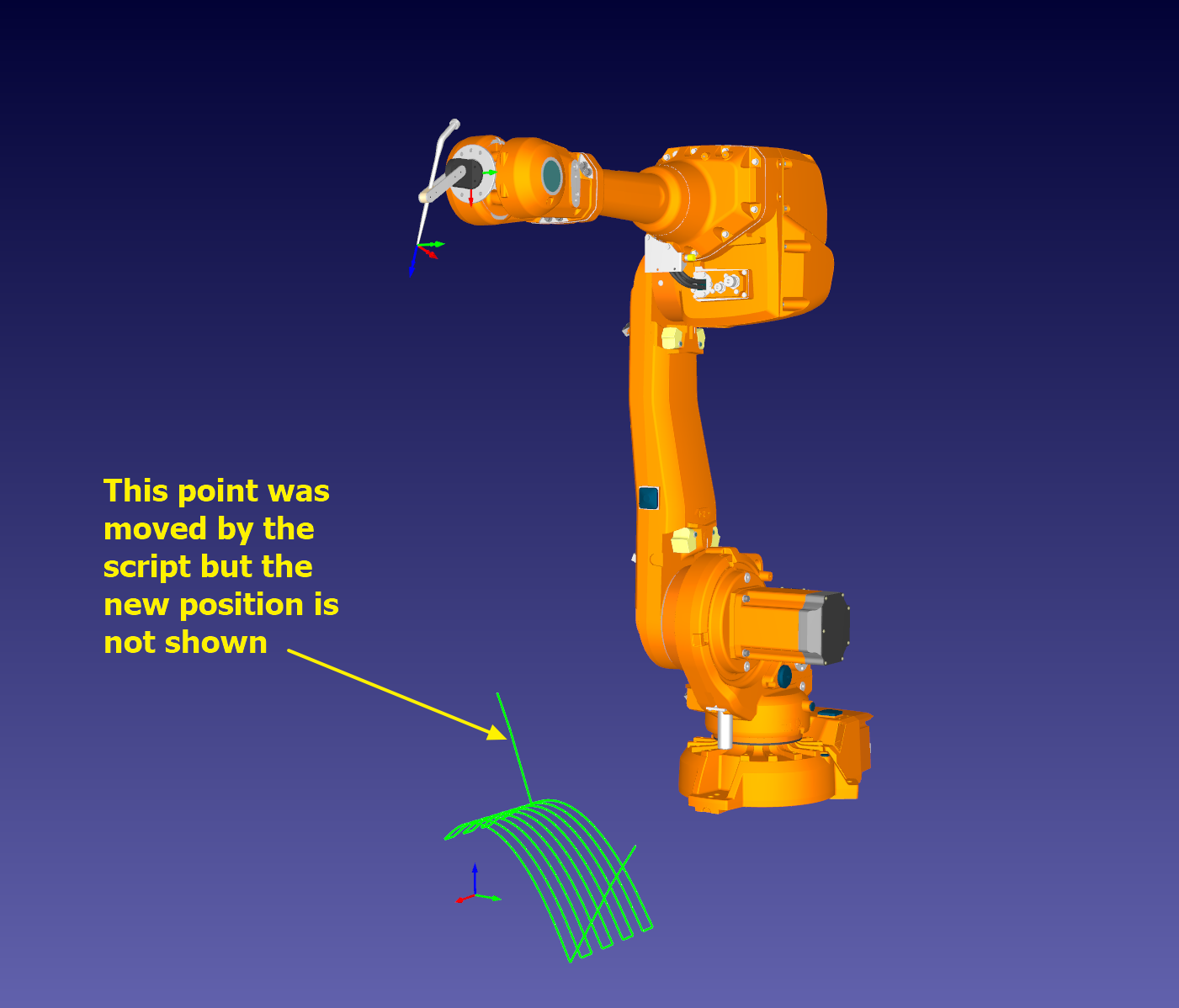 The attached Python script (also shown below) is my minimum example. It moves the position of the first moveL instruction. It seems to be moving the position because the robot path shows it, but the green polyline does not reflect the changed position. The two attached images help to explain.