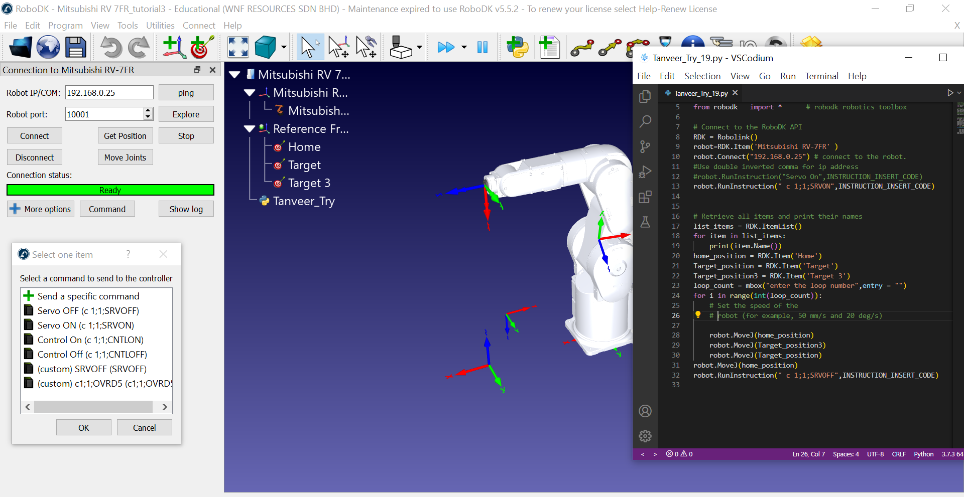I'm using a Mitsubishi robot controlled via the RoboDK Python API. I am trying to turn on the servo from the python script and after cycle operation I want to turn off the servo. But cannot achieve this. Please find the attached image that contains my script code and the setup. I am also attaching the script code here. Kindly advise on my wrong steps.