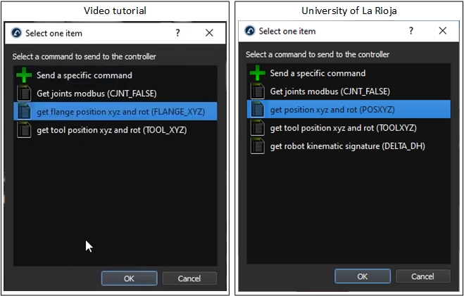 However, we have noticed that the command list is different in our version of RoboDK (v5.2.1) than from the one in the video tutorial (see the attached image). In our case, we do not have the command FLANGE_XYZ. Instead, we are using the command POSXYZ, which we supposed that would do the same, but we cannot obtain the propper coordinates for the TCP definition. As we have seen, it seems that RoboDK gets the coordinates of the flange of the real robot, but it immediately assigns them to the tool (not the flange), thus making the robot in RoboDK to adopt a very different pose than that of the real robot.
