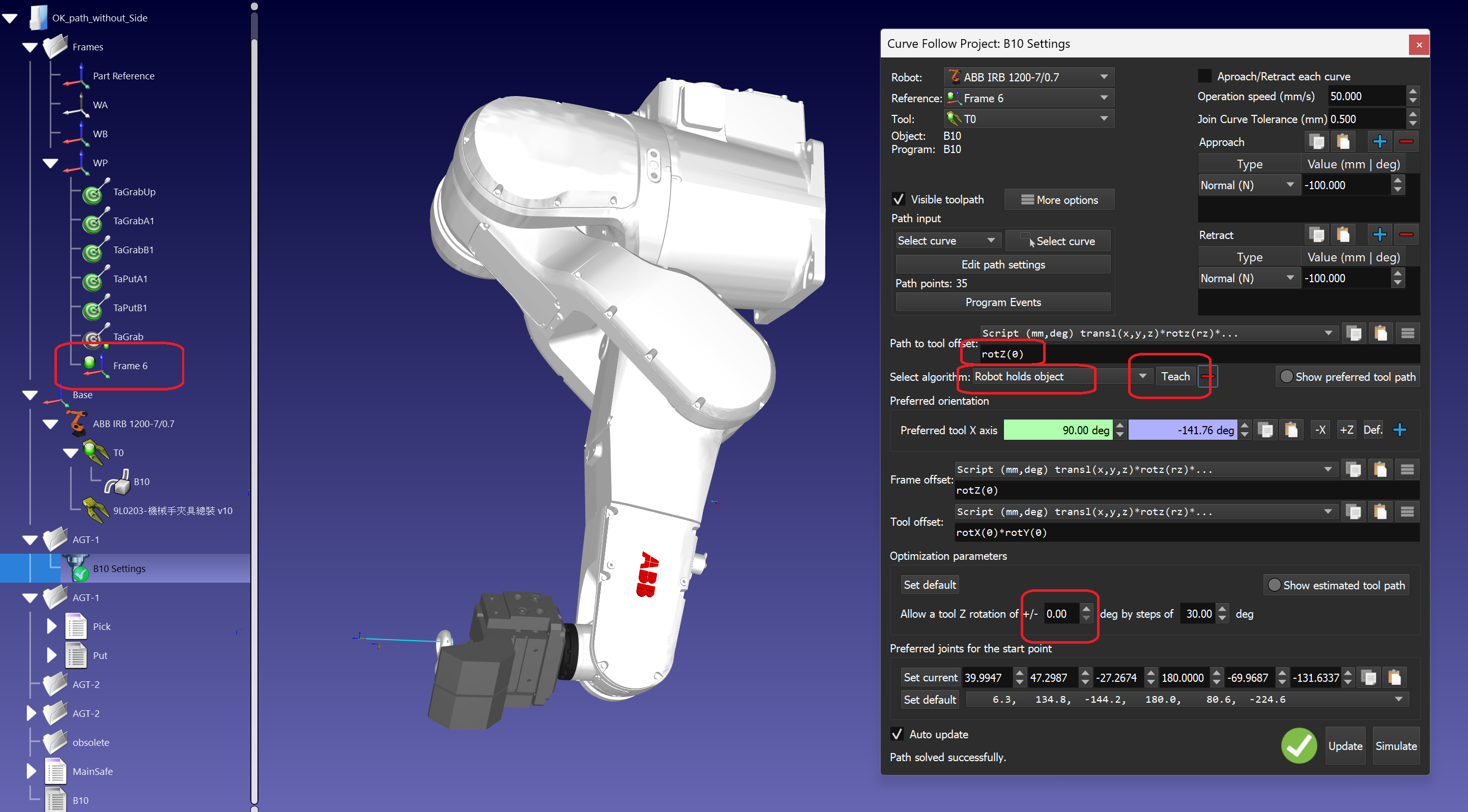 (03-31-2025, 07:00 AM)Albert Wrote: In this case you can simply impose the Robot holds object & follows path algorithm and increase the tolerance to allow a tool Z rotation to see if the path is feasible. Since you don't want to alter the Z rotation you can then set this value back to zero and adjust the path to tool offset to make the path feasible without changing the orientation of the cut.