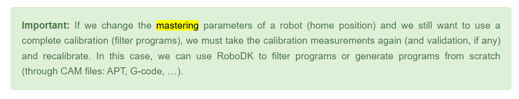 Please note the mastering program from RoboDK does not reset the mastering for joints 1 and joint 6. You need reference points for these to work. However, mastering joints 1 and 6 is not so important because these parameters are redundant with defining the robot TCP and your reference frame.