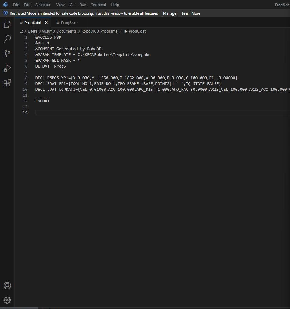 - Tool and base frames are defined and matched between RoboDK and the KUKA controller.