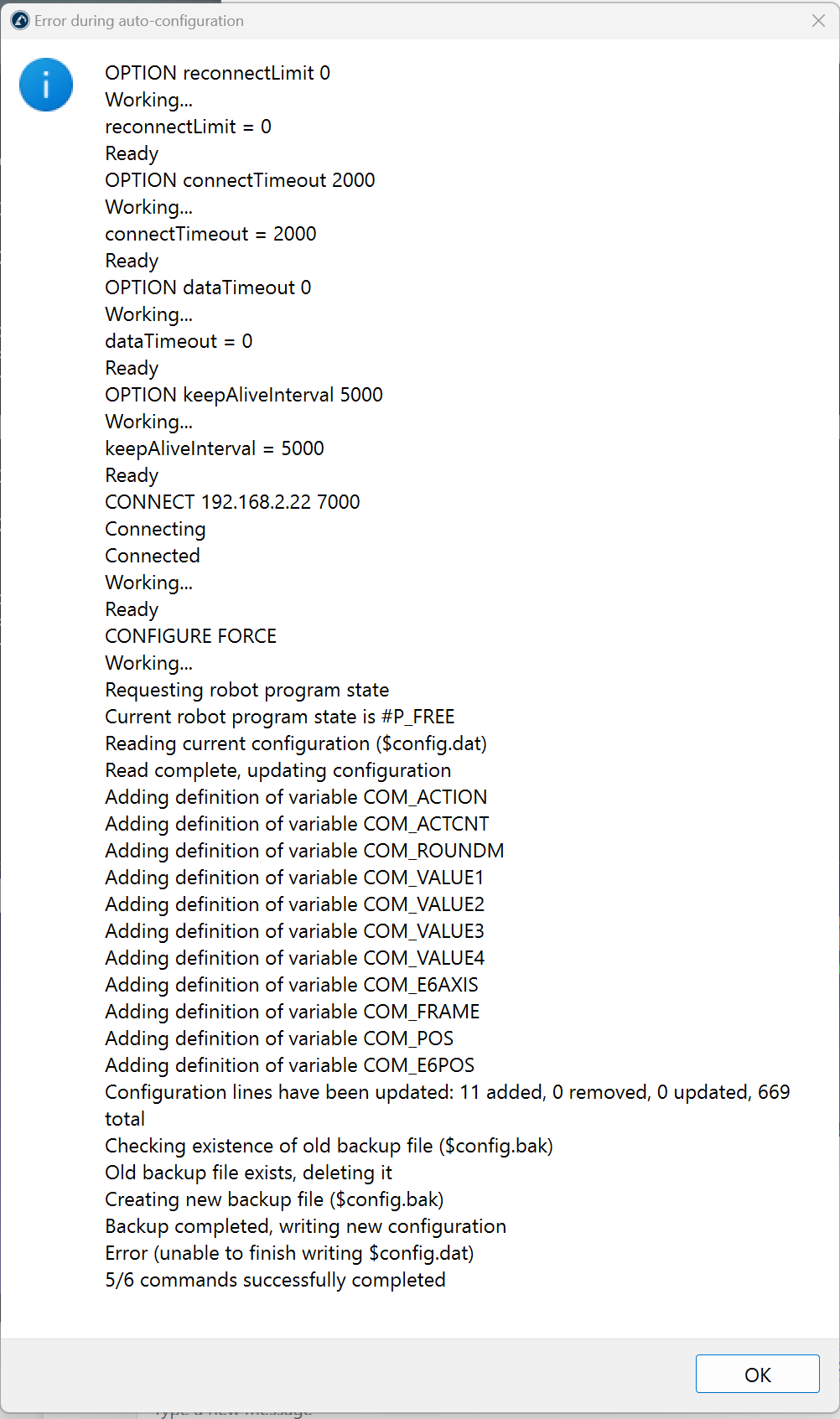 Hi there, currently getting an Error (unable to finish writing $config.dat) 5/6 commands successfully completed while running the KUKA Driver Auto Config script with RoboDK.