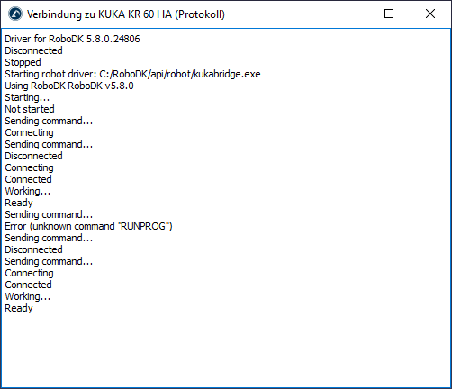 Now i want to do the excution directly from RoboDK. I did follow the instructions from https://robodk.com/doc/en/Robots-KUKA.html#DriverKUKA and I can now execute move commands. So the connection seems to be working. But if I execute my program the tool does not turn on. So the robot moves with an inactive tool.