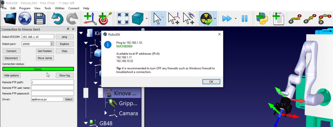 Curiously, RoboDK says that it is connected to the robot without being connected by clicking Connect, you can check it in the file in the download link