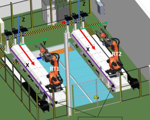 The system setup is a pair of KR4 controllers with a robot and rail on each controller working as master and slave with the second robot mirroring the first robot during an inspection.