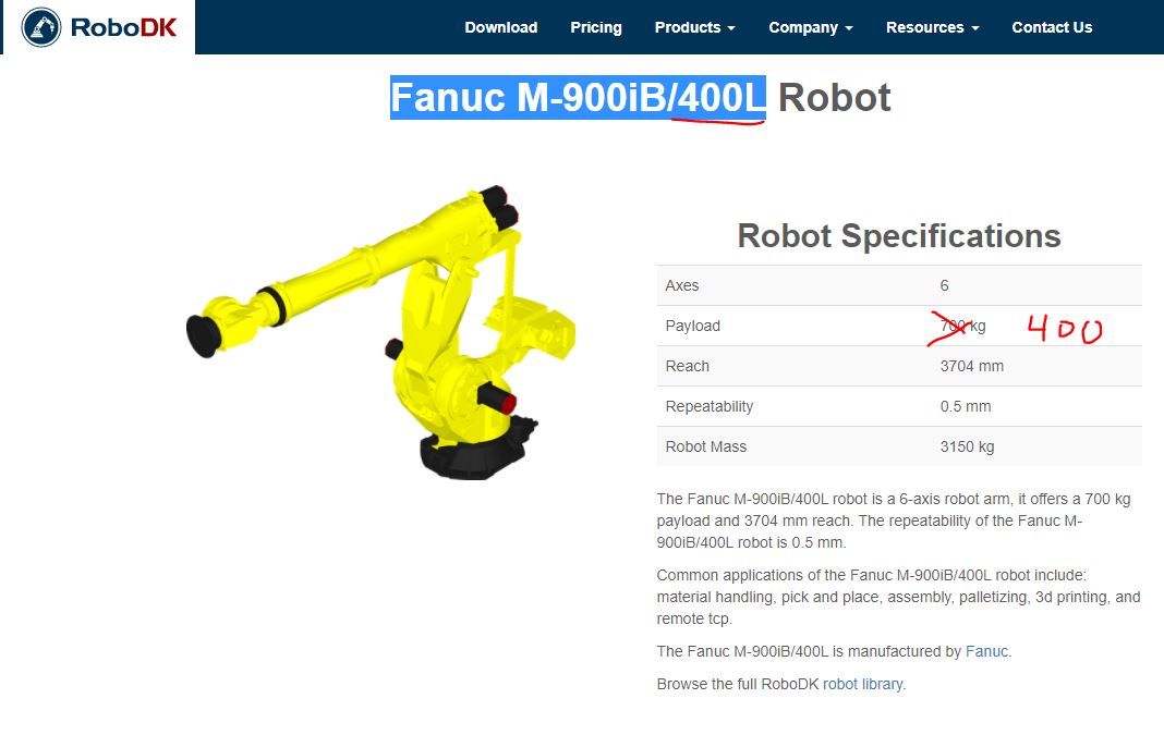 The specs shown on download web site section of the Fanuc M-900iB/400L, payload is wrong, should be stated 400kg not 700kg