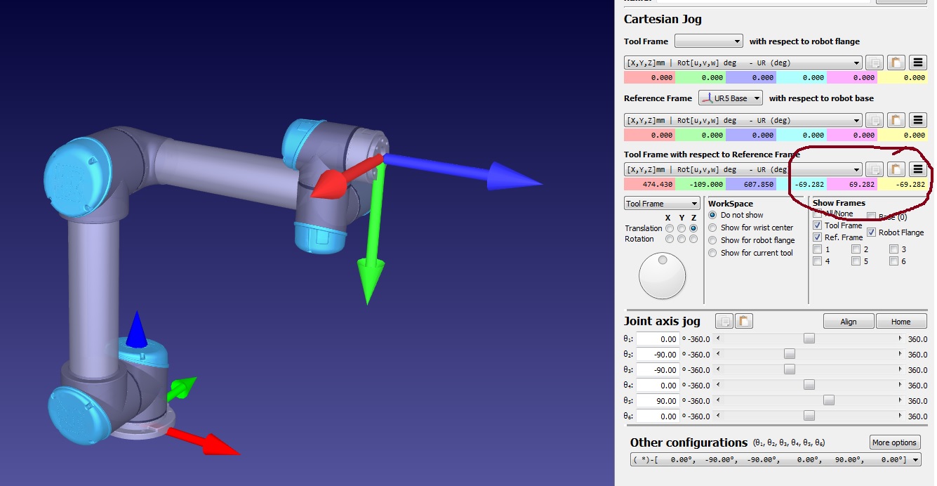 I have enclosed a simple figure and i would like to have a physical explanation for the angles that are displayed when I load the UR5 robot into RoboDK. I think that if the rotations are wrt the base, the angles should either be 0 or 90 deg. What do these figures encircled in the jpg attachment mean?