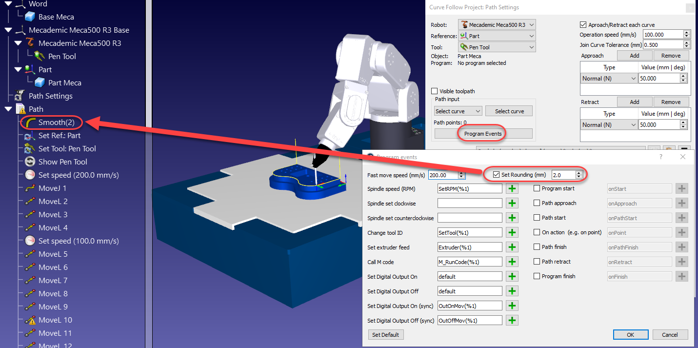 On the other hand, when you use the Run on robot option most robots will execute one instruction at a time. I recommend you to use the option Send Program to Robot" instead to make sure that the smooth effect (also called cornering in Mecademic's documentation) is properly applied.