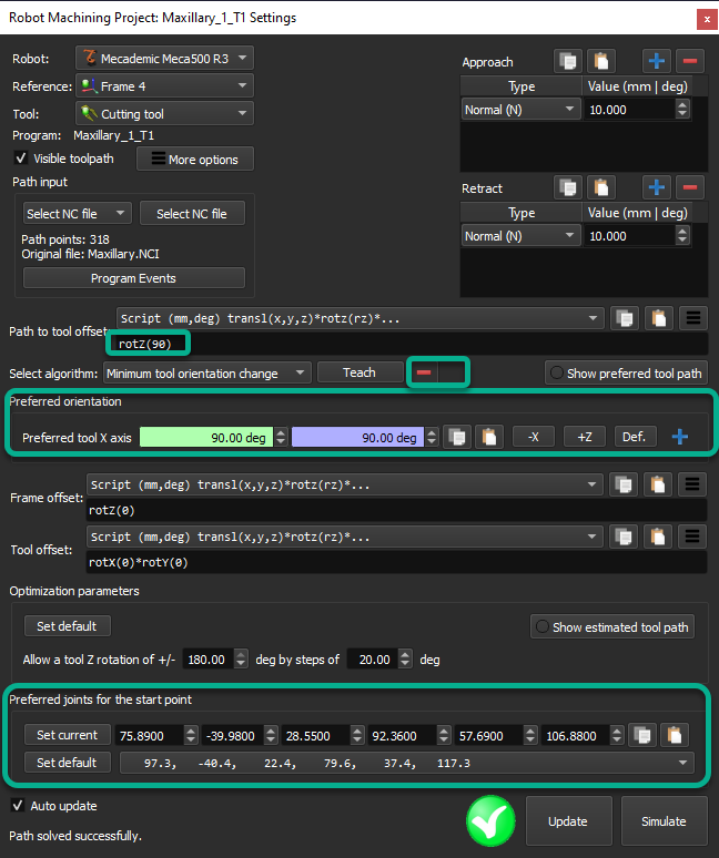 I moved the robot base 10 mm toward the part and I changed the tool orientation to 90 deg and 90 deg under "preferred orientation".