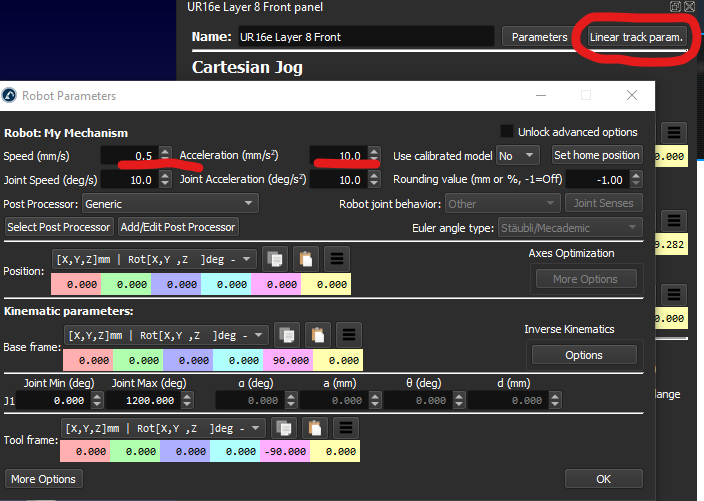 (05-15-2020, 06:05 PM)Jeremy Wrote: Hi Carlom, I assume "Linear track param." is where I need to be? I didn't see options for the linear axis after clicking "Parameters." Regardless, it still seems to run at the same speed no matter what value I have for speed. I have the UR synchronized to this linear axis. Is that the reason?