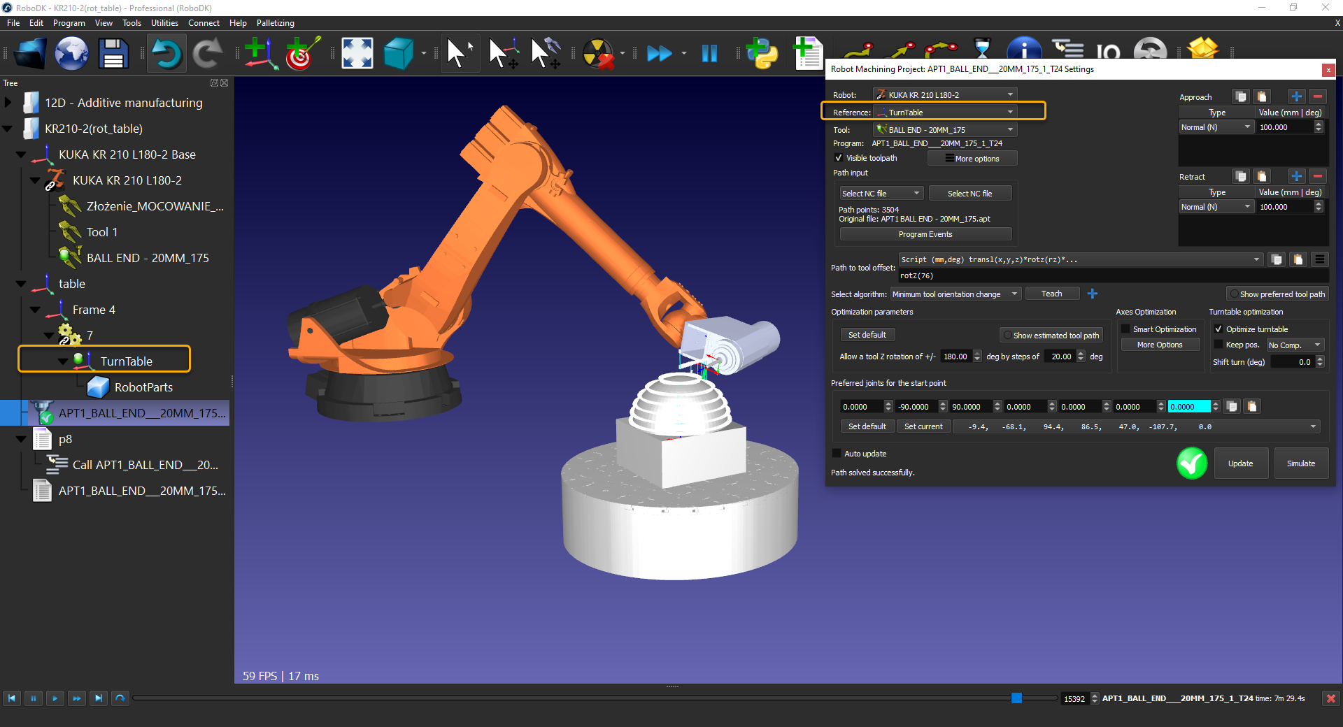 I have the attached setup in which I want the robot to mill the element using the external axis. The expected behavior is: the robot approaches, takes position and then the external axis turn, then the robot change position and the external axis turn back and so on until the end of the program.