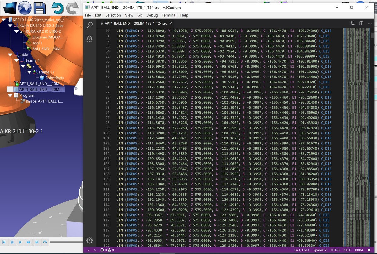 In the program, everything works very good, but in real, the table rotates in the one direction, the robot in the other. I looked at the code in other programs and in them, with such an operation, only the value of E1 changes, but X,Y,Z,A,B,C don't change. Do you have any suggestion to solve this?