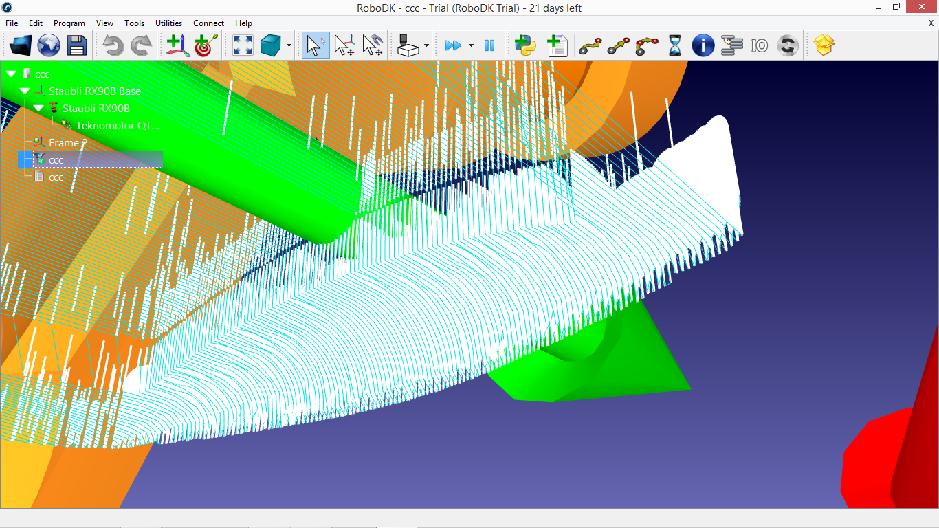 Using the Adept V+ custom for Staubli post processor.  This program is about 22,000 lines of code intended to make refining cuts - not finishing.