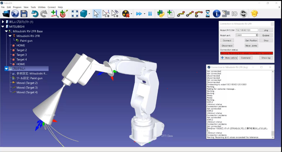 The warning of connection status says “receiving joint values exceeded the tolerance”.