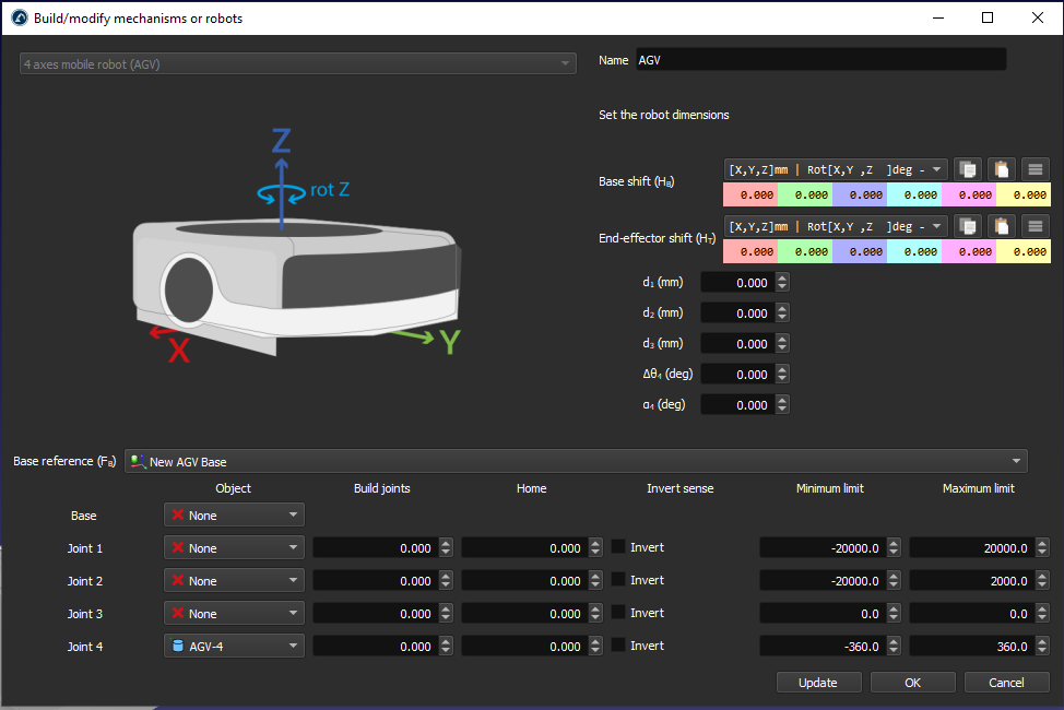 I created a new robot by importing a 3D CAD AGV model with 4 axis mobile robot (AGV) following the RoboDK website training video.