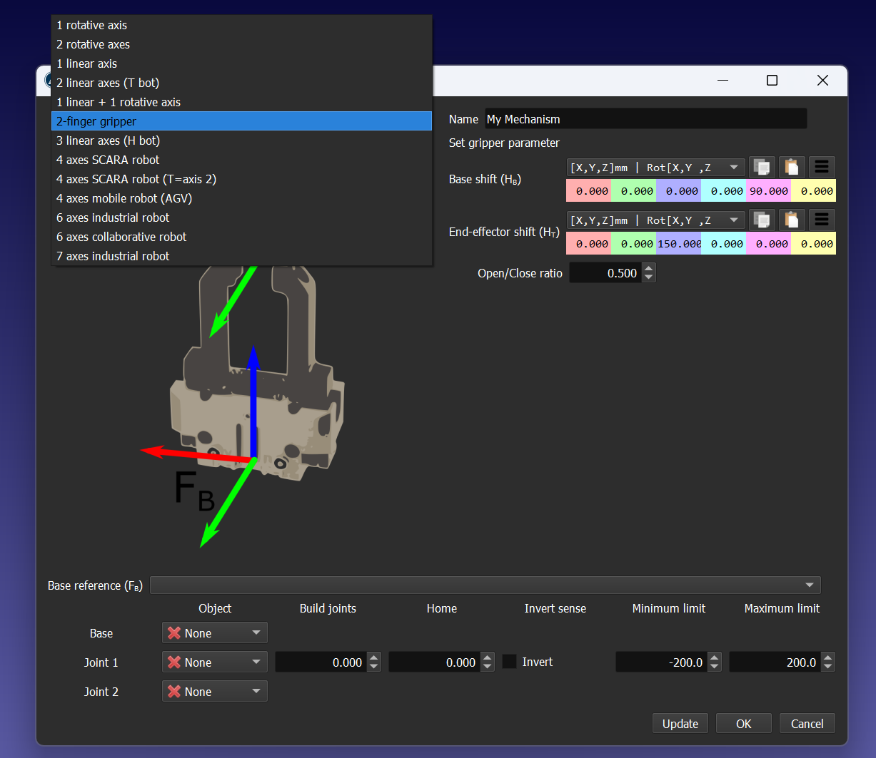 You can take a look at this example where we copy the DH table from a robot and apply it to an "unlinked" robot: https://robodk.com/stations#filter?name=...th+abb+irb A lot of users have also been successful creating custom mechanisms by combining our template mechanisms with a parent child relationship e.g. putting the base of a mechanism in the flange of another one. |