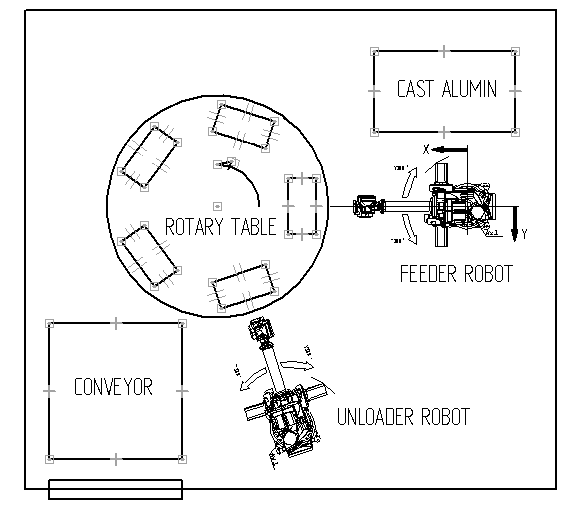 I am Brazilian and my last paper consists of a complete robotic cell where the robots have to pick and place a determined product (take a look at the picture attached) and put it on a turntable.