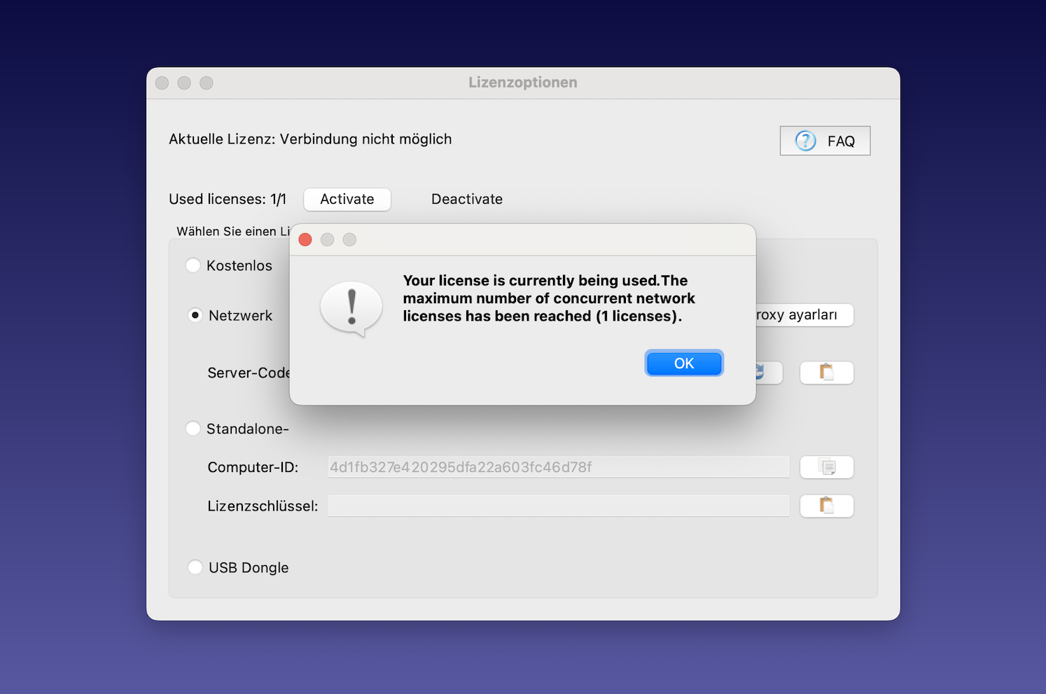 My first thought was, something went wrong with the installation. So I deinstalled everything and reinstalled the program. This doubled the problem. Now I am told, I can not activate the license, as it is already used....