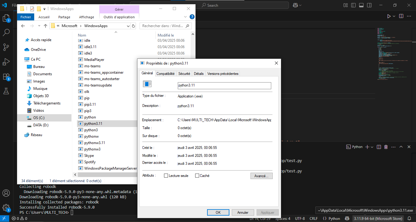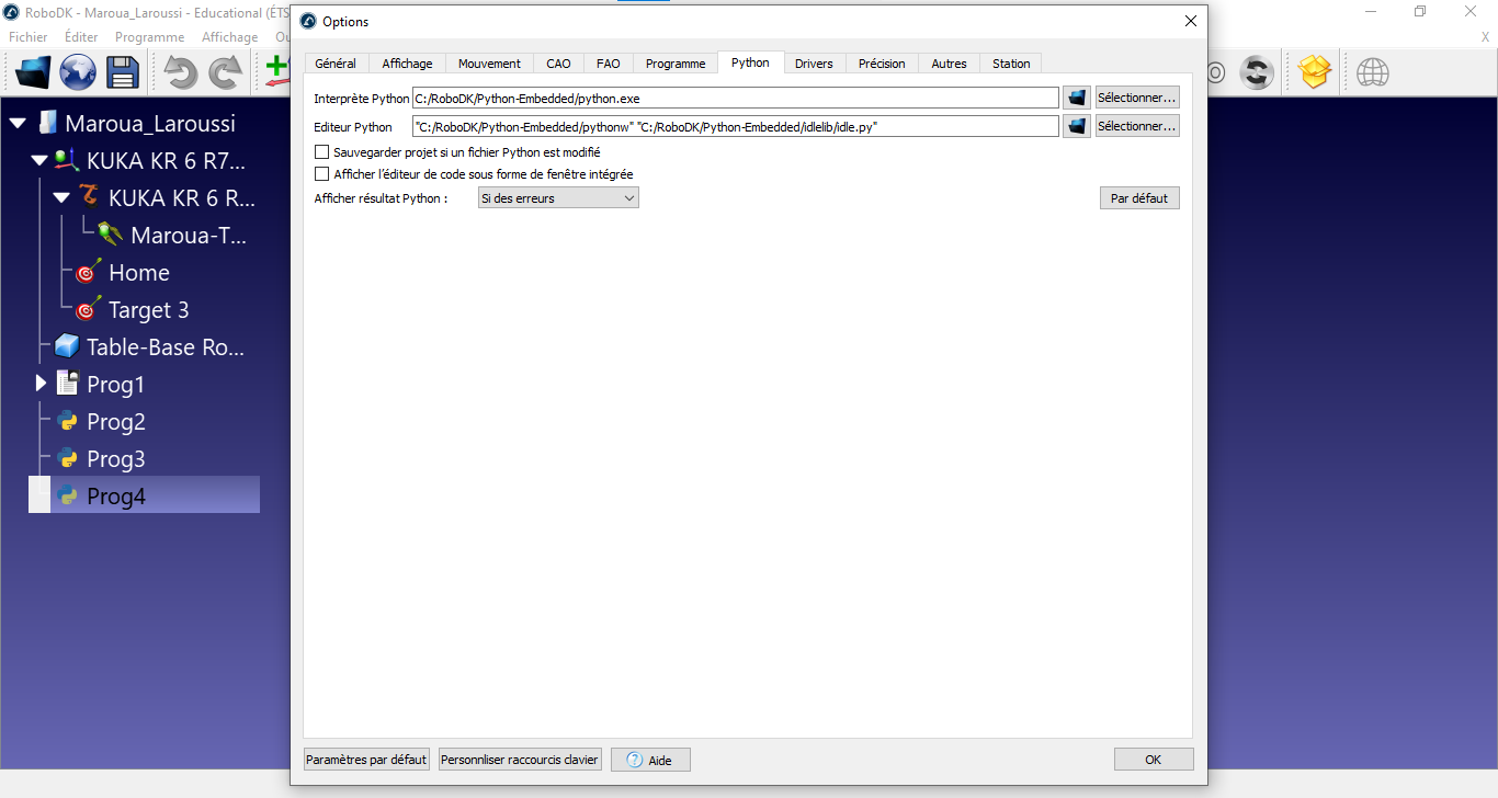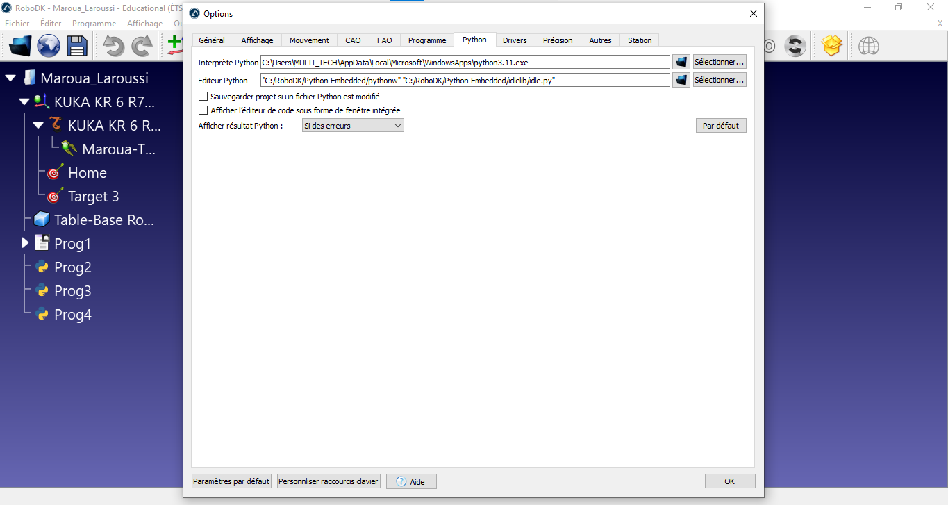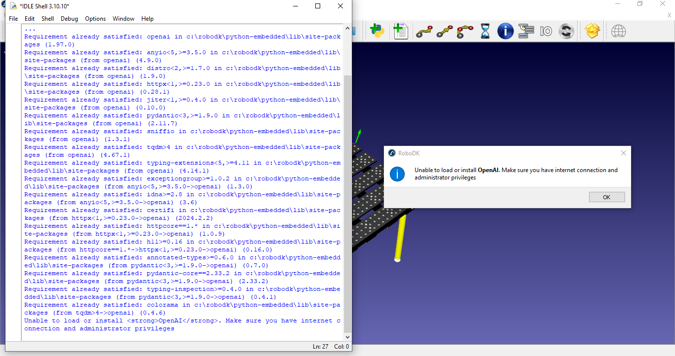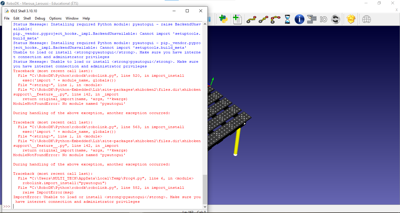 I have a Python code I use for a calibration project and it works well if i run it with VScode. If I import it to roboDK and run it from there, it returns me an error (attached image) because of libraries such as pyautogui, OpenAI, and Image from PIL that are not installed. I tried changing the python interpreter (Tool -> options -> Python) with the instruction "import_install" but it didn't work. Could you please help me solve this problem?