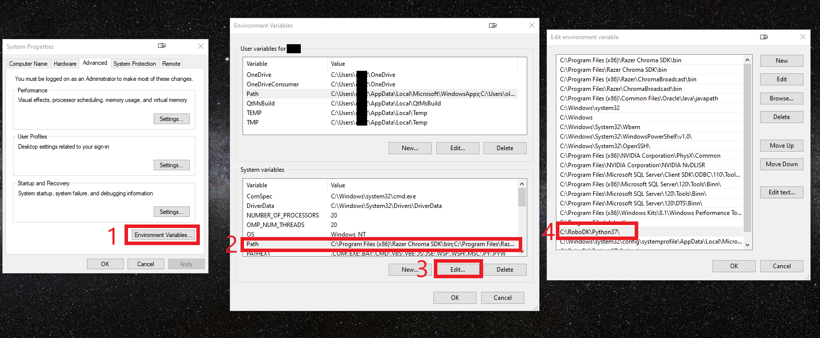 In the search bar, search for "Edit the system environment variables"->Advanced->Environment Variables->Go to the "System variables" window and select Path->Edit...->Make sur you have C:\RoboDK\Python37\ here.