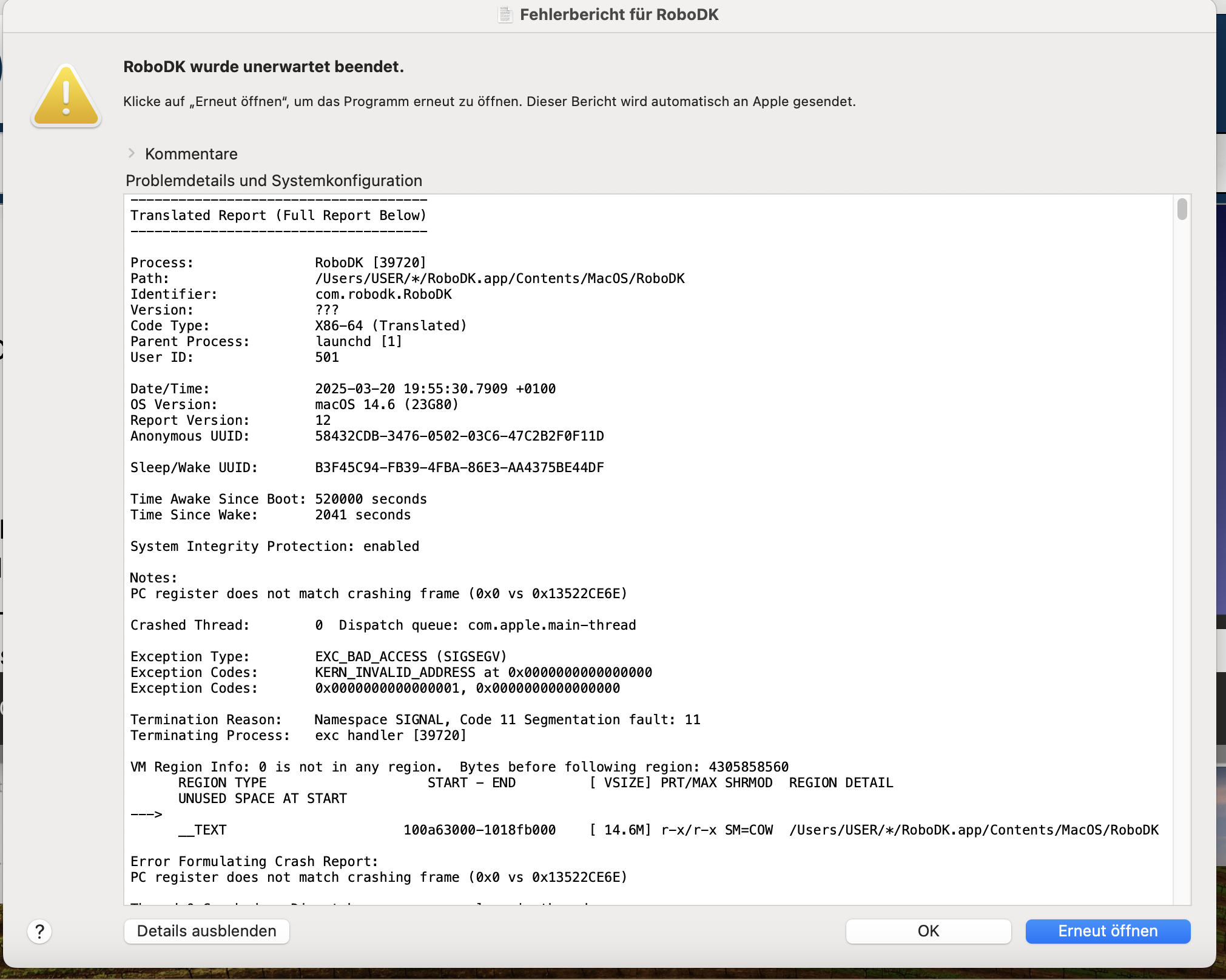 When using the "process"-button, the program Robodk gives me the message "unexpected error" and ends the program.
