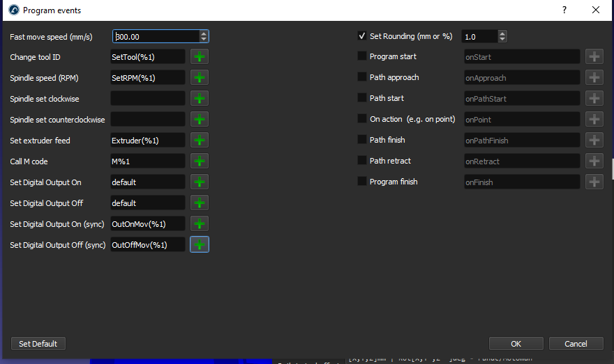 In the Program Event window I change to M%1 as you can see. I use subprograms named; lets say M104. Inside M104(not the mcode but program) I would write T1 S260.