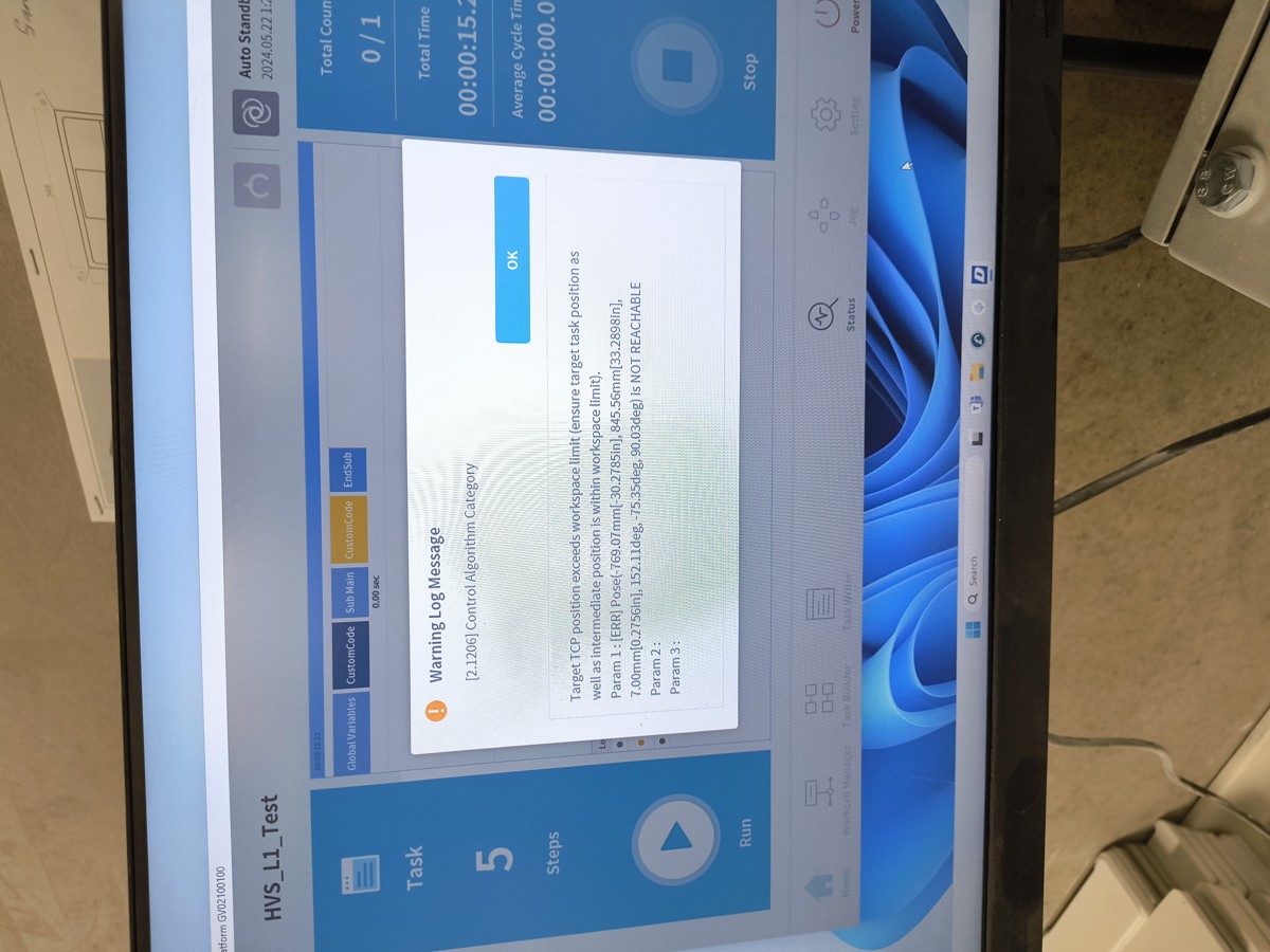We're running into issues with the generated robot program. The program is causing an error: Warning Log Message (12.1206) Control Algorithm Category