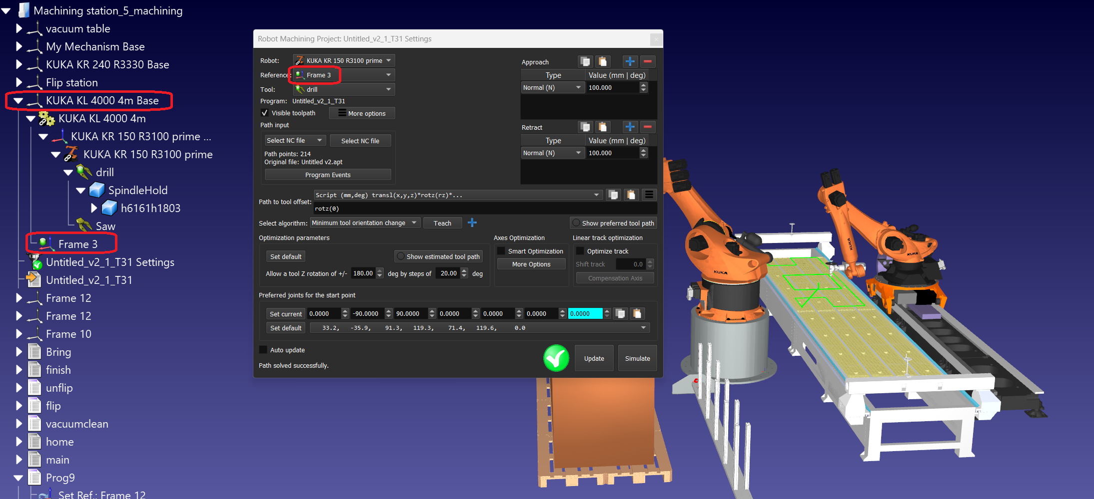 I am facing an issue with my machining process simulation in RoboDK. According to the videos 1 and 2 you will see (I apologize for the quality), I do not know why with the previous toolpath (Untitled...), it can move along with the frame to the workpiece position, but with the latter one (Machining1), the frame fixes there and it makes the simulation to be wrong, while initially both have the same settings.