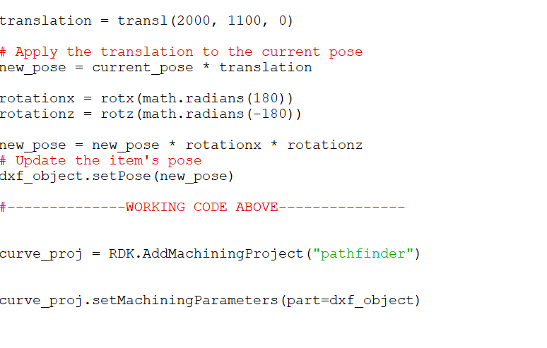 However, I want to automate the dxf placement and curve selection process so when I choose a different dxf, I can simply run my python file and have a robot program ready. I can already get python to place the DXF where I want it, but when i use the SetMachiningParameters() function, it only recognizes and selects one of the many curves.