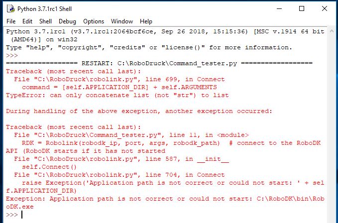 RDK = Robolink(robodk_ip, port, args, robodk_path)It raises a type error stating that a concatenation of list and string is not possible (see attachment). Looking into robolink.py it becomes clear that the inputs of robodk_path and args are being concatenated. Where robodk_path is transformed to a list automatically, args is handed over as it is declared in the first place (see attachment), in this case as a string.