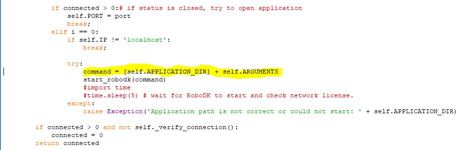 RDK = Robolink(robodk_ip, port, args, robodk_path)It is really not a big deal but it might be worth mentioning that command line arguments should be given as list: