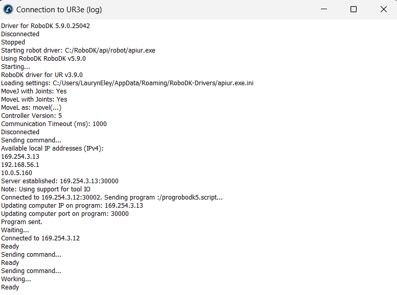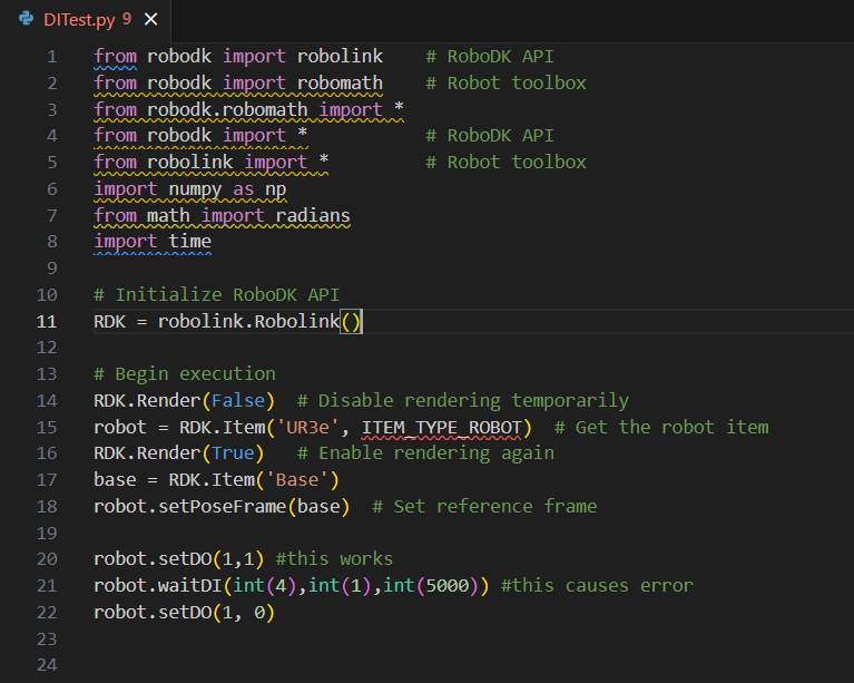 I've got a Python script for a UR3e robot from which I am successfully controlling digital outputs using the setDO command. However, I also need to read an input as part of my script. Using the I/O buttons on the graphical interface, I can do this successfully, however, when I try to use WaitDI within my Python script, the script crashes with the error message below (after successfully switching on a digital output in the preceding line!)