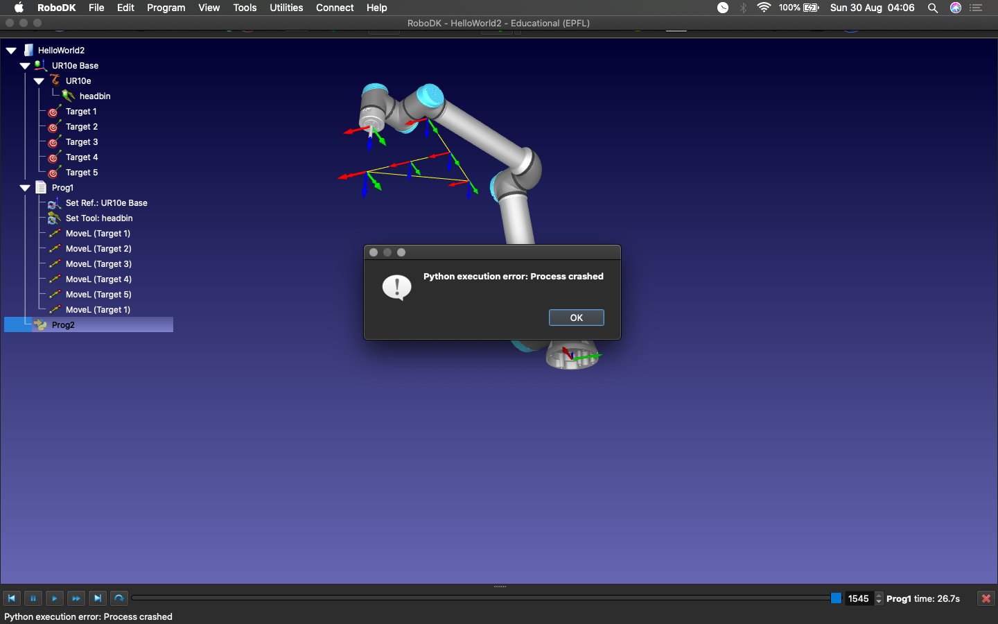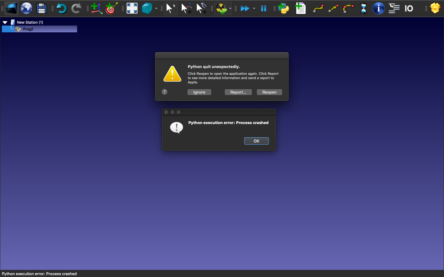 The same code is running perfectly from the python shell on mac. It is just not running from inside RoboDK.