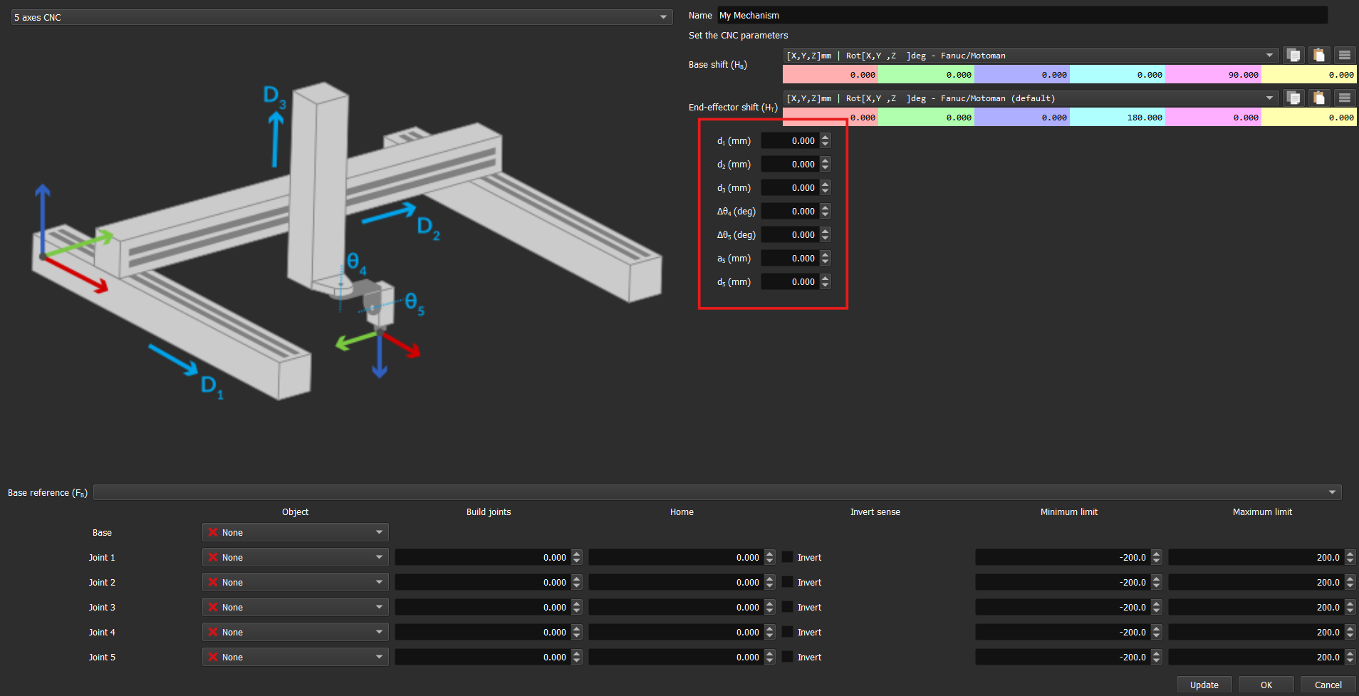 The parameters needed to create a 5-axis CNC are the parameters in the DHM table (Denavit Hartenberg Modified parameters).