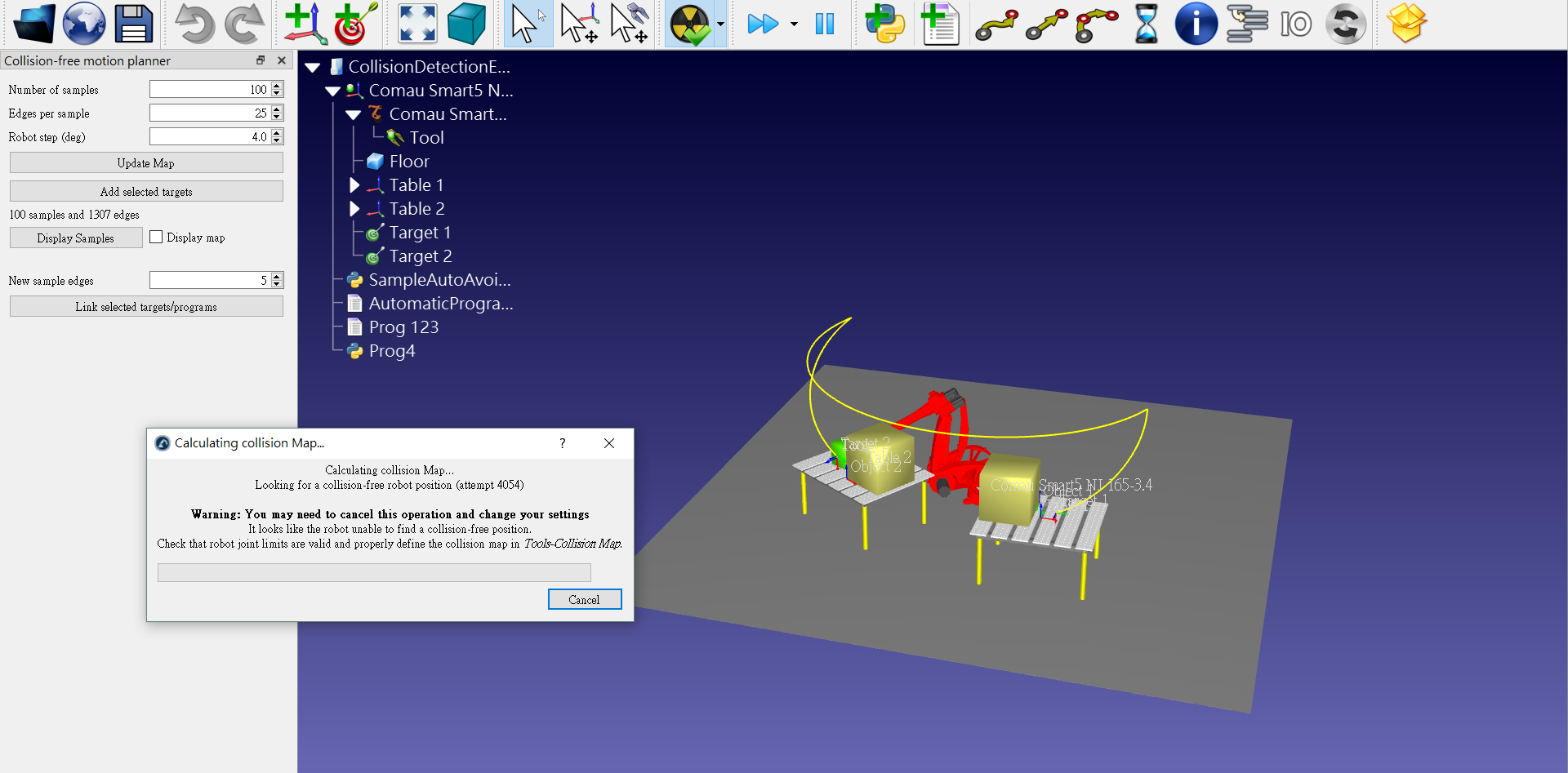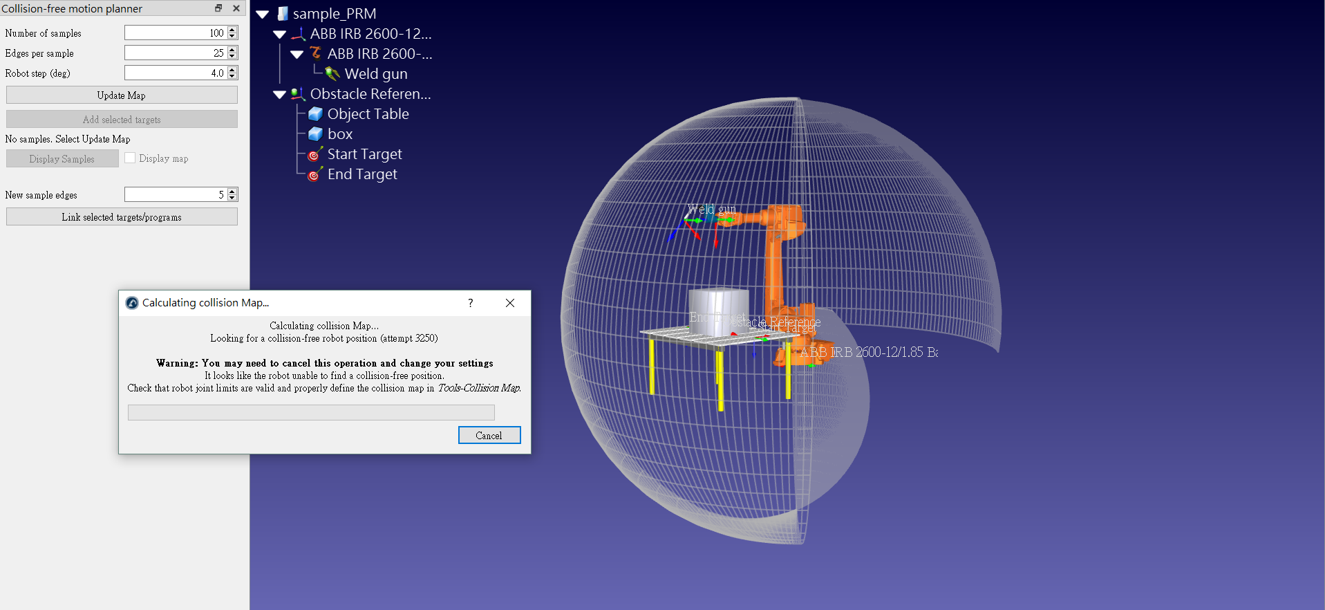 I follow the RoboDK documentation (https://robodk.com/doc/en/Collision-Avoidance.html#CollisionPRM) to create the collision-free-map step-by-step, but the calculation didn't success. (I tried many times, no matter how long did it take, it didn’t success.)