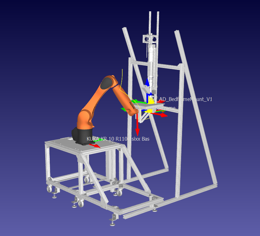 I have a pellet-based extrusion setup for Large Format Additive Manufacturing (LFAM). In this setup extruder is used as a fixed tool and bed frame is attached to the KUKA KR10 robotic arm via a mounting flange.