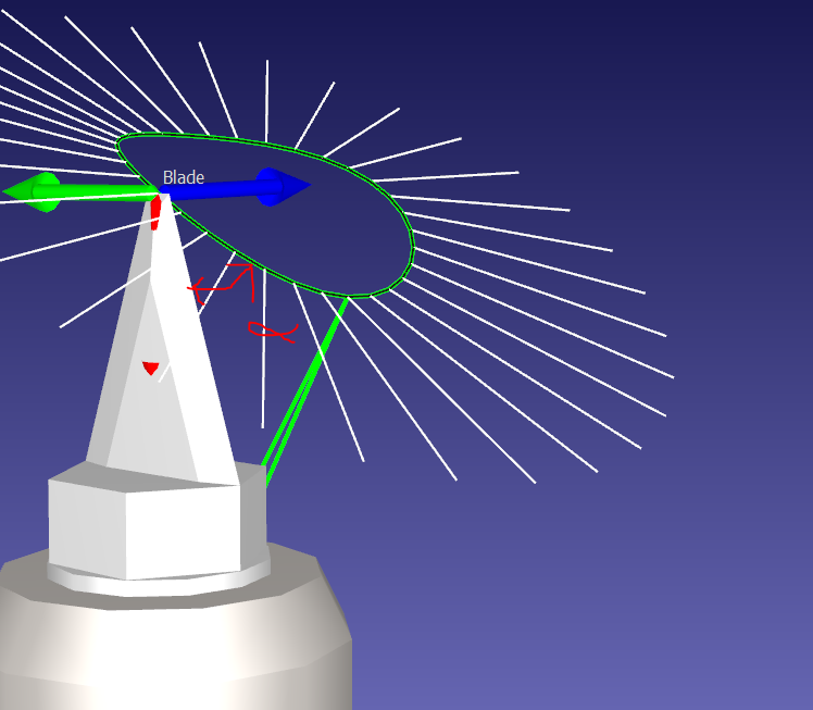 Since this is a knife blade, the knife blade must rotate to be able to stay tangeant to the cut line . The blade must also have an angle of attack (alpha) around 70°