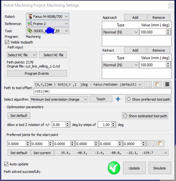 I have a machining project with particularly tight working conditions. No matter the machining settings, I'm getting what looks like 90 degrees of Z rotation, even when the "Allow a tool Z rotation of..." is set to 0 or 5 degrees.