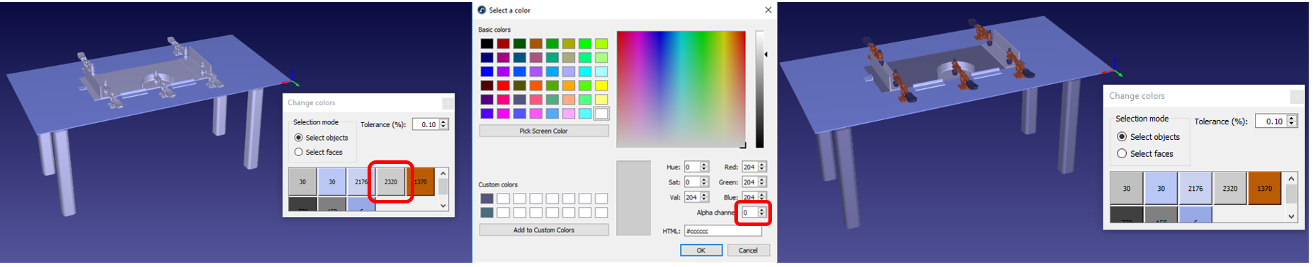 Second, if you still don't see the colors, it's often because they were not apply on the right body of your CAD model. To reveal them, go in "Tools -> Change color tool". Select your object and look for the color that is over the other colors and bring the "Alpha" value to Zero. See picture.